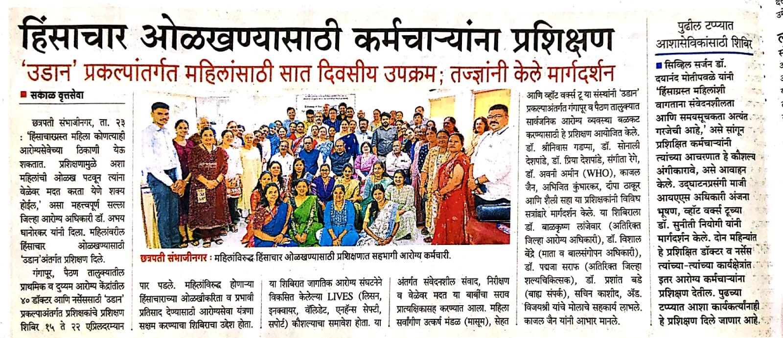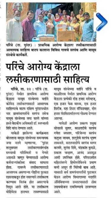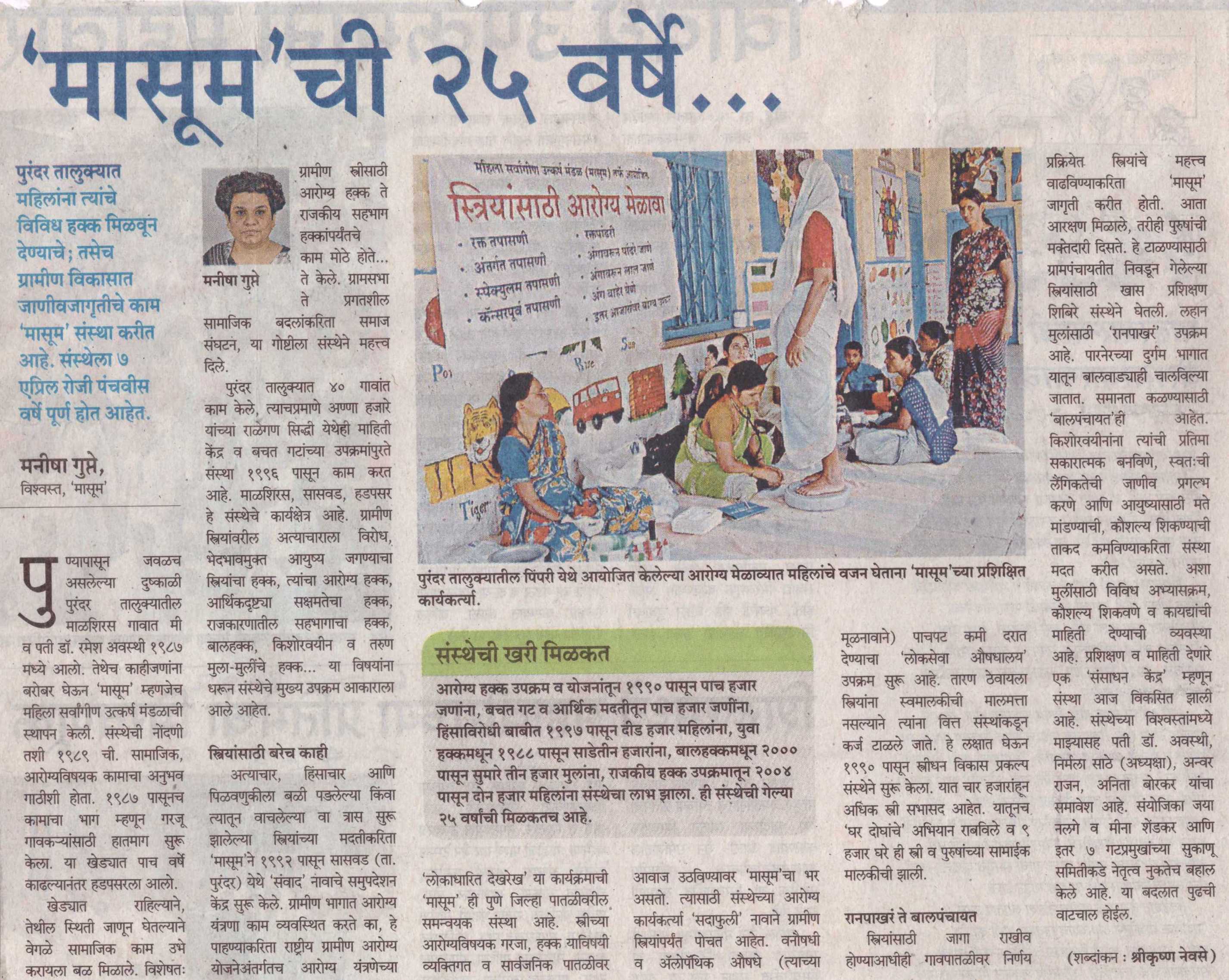 महिलांविरुद्ध होणार्या हिंसाचाराची ओळख आणि सहाय्य देण्यासाठी आरोग्य कर्मचार्यांना प्रशिक्षण - गोदावरी स्मार्ट - २५ एप्रिल २०२५ हिंसाचार ओळखण्यासाठी कर्मचार्यांना प्रशिक्षण - सकाळ - २४ एप्रिल २०२५ वंचित गटाने नेतृत्व करावे - लोकसत्ता – ८ मार्च २०२५ मासूम आणि सेहत संस्थेतर्फे छत्रपती संभाजीनगरात कार्यशाळा - सामना – १० जुलै २०२४ कार्यशाळा - महिलांवरील हिंसा आणि आरोग्य सेवांचा प्रतिसाद : महिला सुरक्षा हा विकासाचा महत्वाचा पैलू - संजयवार्ता – १० जुलै २०२४ डॉ. कोल्हे दाम्पत्य मासूमला 'यशोदा माई राष्ट्रीय पुरस्कार' –१० नोव्हेंबर २०२२ पिंपरी गावात महिला शेतीच्या मालकीण – पुढारी – ५ ऑगस्ट २०२२ पिंपरीत विधवा परित्यक्ता महिलांचा सन्मान – सकाळ – ५ ऑगस्ट २०२२ सासवडच्या वाघिरे महाविद्यालयाचा मासूम संस्थेबरोबर करार कारभारीण झाली शेतीमध्ये सहहिस्सेदार महिलांना मिळाला शेतकऱ्याचा दर्जा – प्रभात – २५ फेब्रुवारी २०२२ घराची मालकी तीच्या नावे - सकाळ मासूम माध्यमातून स्त्री सक्षमीकरण – पुढारी – २२ डिसेंबर २०२१ मासूम संस्थेला “शिवसह्याद्री पुरस्कार” – पुढारी - १७ नोव्हेंबर २०२१ “मासूम” कडून आरोग्य साहित्याचे वाटप – २७ ऑक्टोंबर २०२१ परिंचे आरोग्य केंद्राला लसीकरणासाठी साहित्य – २३ ऑक्टोंबर २०२१ घरची ‘लक्ष्मी’ झाली शेतीची सहहिस्सेदार – प्रभात – २७ ऑगस्ट २०२१ कारभारणी झाल्या सातबारावर सहहिस्सेदार – सकाळ - २७ ऑगस्ट २०२१ परिंचेत बालविवाहाचा पथनाट्यातून उलगडा - २०२१ भोरमध्ये रंगला नवविवाहित जोडप्यांचा आनंद मेळावा – २०२१ सातबारावर आता पती - पत्नीची समान नोंद महिलांच्या आरोग्याचा हक्क अबाधित असावा - २ जून २०१८ मासूम चळवळ – पुढारी - ८ मार्च २०१५ सासवडला आरोग्य हक्क संवाद – सकाळ - १६ मार्च २०१४ ‘मासूम’ चा अभ्यासक्रम – सकाळ – ४ जून २०१४ ‘मासूम’ तर्फे पुरंदरला ‘युवा संवाद’ – सकाळ – २४ डिसेंबर २०१४ ‘तिच्या’ प्रयत्नांचा महिलाना आधार – ८ मार्च २०१२ ‘मासूम’ची २५ वर्षे – ६ एप्रिल २०१२ पुरंदर तालुक्यात वर्षभरात २८ बालमृत्यू – १६ मार्च २०११ ‘मासूम’ तर्फे होत आहे महिला सबलीकरण – १० जून २०११ मुलींच्या भ्रूण हत्येविरुद्ध नवा कायदा – लोकमत – १४ ऑगस्ट २०११ मासूम; महिला सर्वांगीण उत्कर्ष मंडळ – पुढारी – २८ सप्टेंबर २०११ घाबरू नका; आत्मविश्वासाने आवाज उठवा – सकाळ – १६ एप्रिल २०१० ‘सदाफुली’ द्वारे ५ रुपयांमध्ये कर्करोगपूर्व तपासणी – २६ एप्रिल २०१४ मासूमच्या वतीने कार्यशाळा – प्रभात – १९ जुलै २०१० रूग्णांच्या हक्कांना अंतिम मंजुरी दिली पाहिजे – सकाळ – २९ सप्टेंबर २००९ Public hearing reveals 17 health service denial cases – DNA Pune – 21 December 2009 हडपसरमध्ये महिला दिनानिमित्त समानतेसाठी संवाद – सकाळ – १० मार्च २००८ संघर्